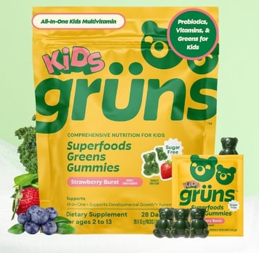 Grüns Multivitamin for Kids is a sugar-free super greens gummy designed to help fill daily nutritional gaps for children in a fun and easy way. These gummy bears are made with over 20 essential vitamins and minerals, along with whole-food ingredients like alfalfa, spirulina, chlorella, fruits, veggies, prebiotics, and adaptogens. Created for picky eaters, they offer a convenient alternative to traditional vitamins while supporting overall wellness, digestion, and daily nutrition. Plant-based, vegan, gluten-free, and free from artificial additives, Grüns gummies are individually packed, making them perfect for busy families and on-the-go routines.