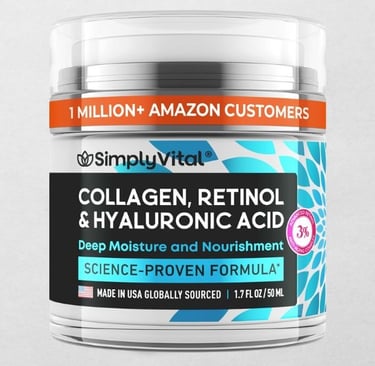The SimplyVital Anti-Aging Face Moisturizer is a daily face and neck cream designed to hydrate, smooth, and refresh the skin without feeling heavy or greasy. Formulated with a powerful blend of retinol, collagen, and hyaluronic acid, it helps improve the appearance of fine lines while delivering long-lasting moisture and a soft, comfortable finish.